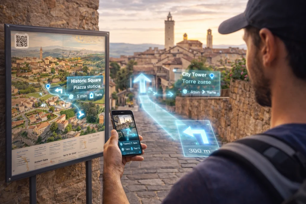 La realtà aumentata nel turismo è una tecnologia che arricchisce i luoghi reali con contenuti digitali contestuali, visibili tramite smartphone o tablet, con l’obiettivo di migliorare comprensione, orientamento e coinvolgimento durante l’esperienza di visita.